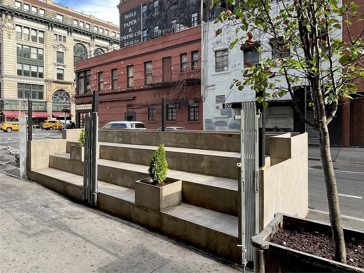 This unique coffee shop setup is one of my favorites. Designed by Nico and Lili Ramirez, owners of Foreigner Coffee in Chelsea. The bleacher/step design is simple and functional. Customers sit facing the sidewalk and the cafe, making it ideal for people watching, and the high side of the structure naturally shields them from dirt and noise from the street. Although it’s made of wood, it’s finished with a concrete-like texture, so it not only looks like a New York brownstone stoop, it feels like one too!